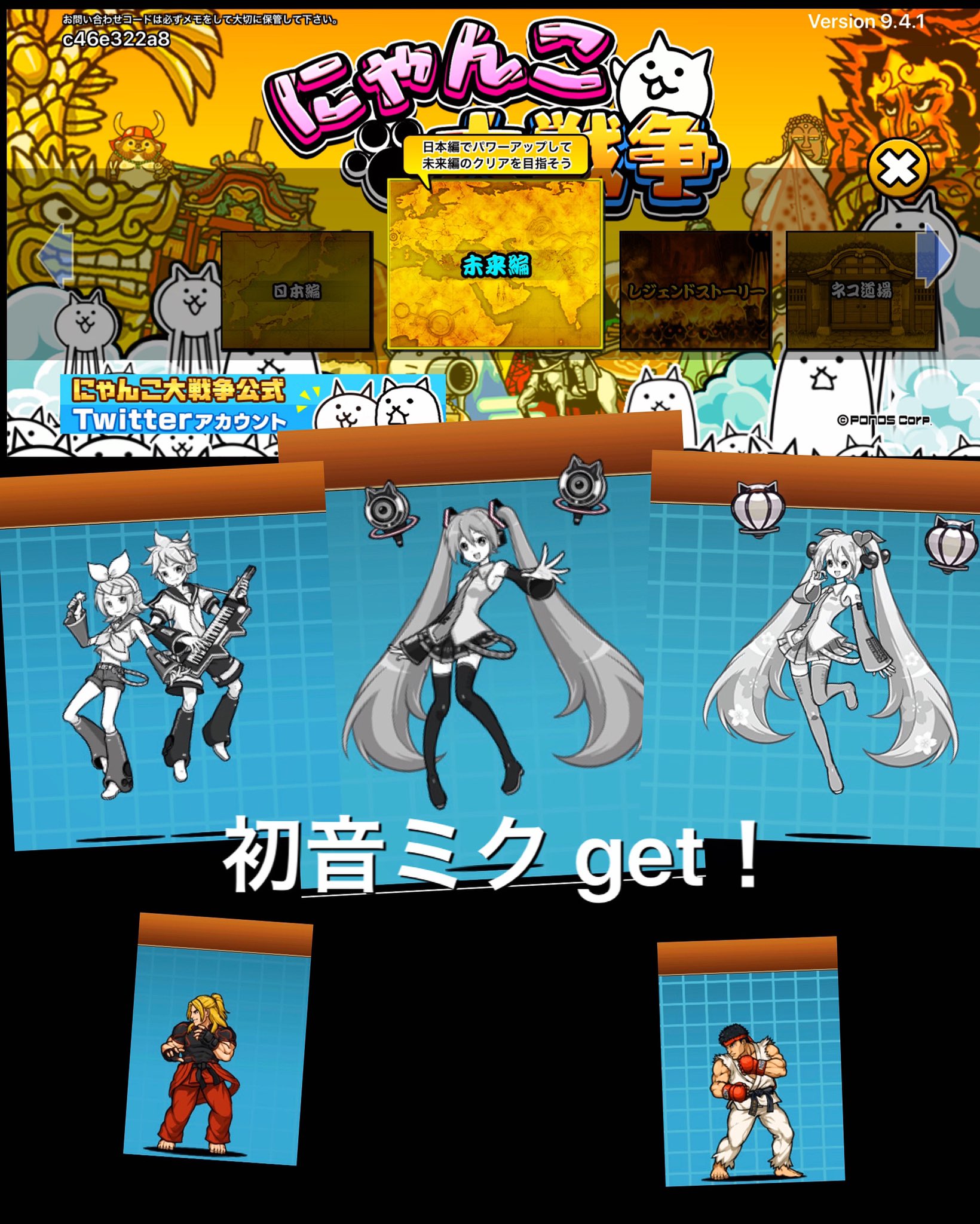 Uzivatel 千葉マサキ Na Twitteru 激闘ゲーム戦記 にゃんこ大戦争 初音ミク ゲット 桜ミク 鏡音リン レンも確保 ストリートファイター コラボの ケン リュウとともに最強の編成で総攻撃だ 日本編は完全攻略 未来編攻めまくり中